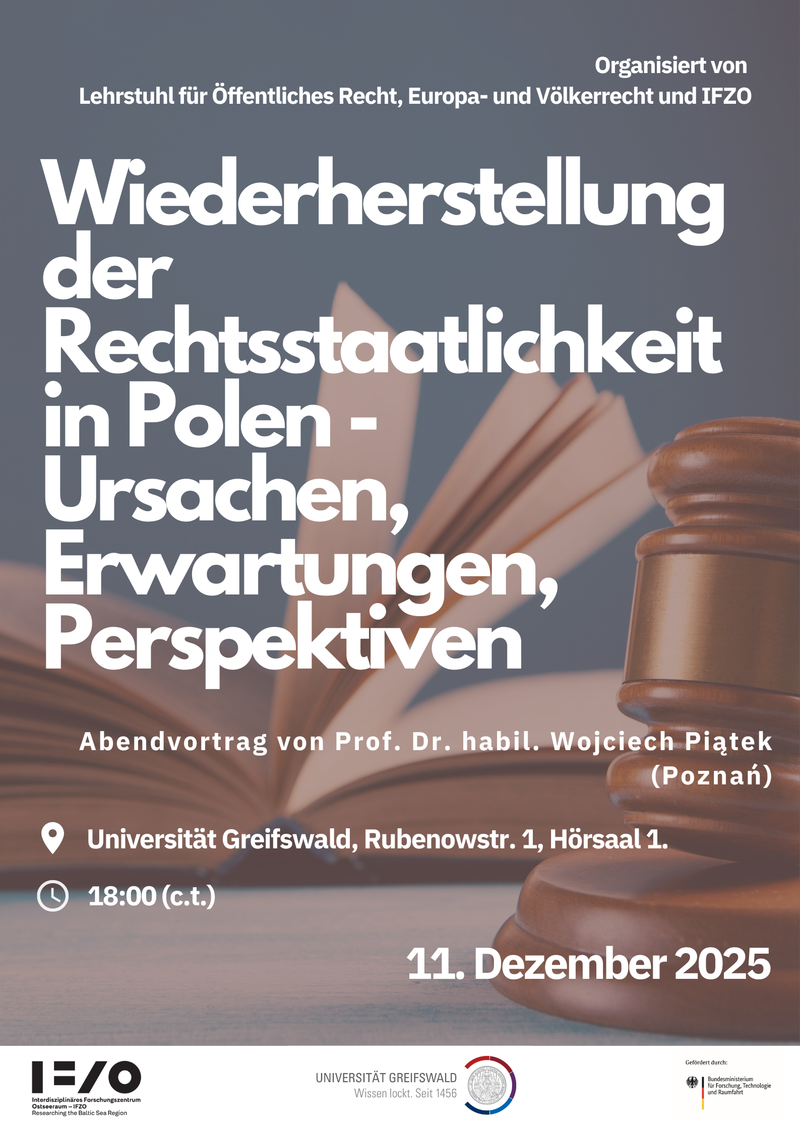 Evening Lecture: Wiederherstellung der Rechtsstaatlichkeit in Polen - Ursachen, Erwartungen, Perspektiven 11.12.2025, 6:15 pm Evening lecture by Professor Dr. habil. Wojciech Piątek Location: Universitity of Greifswald, Rubenowstr. 1, Lecture Hall 1.