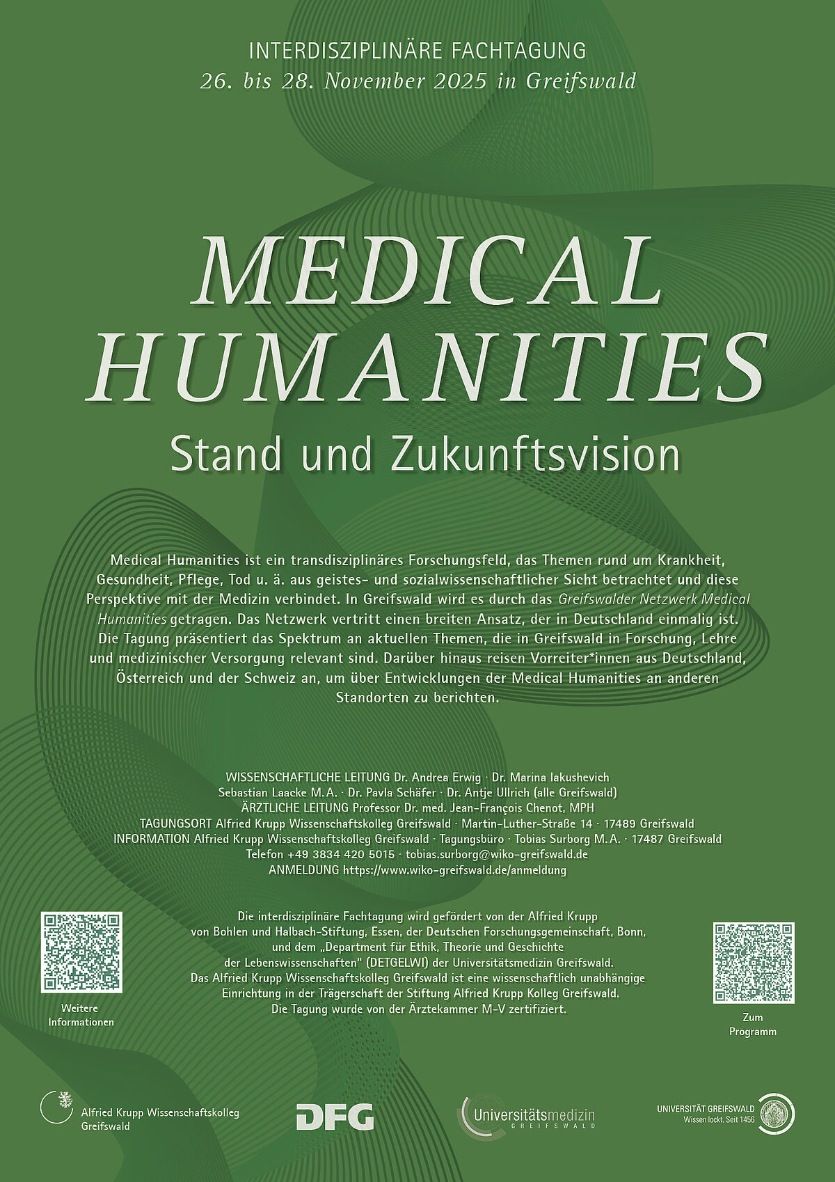 Medical Humanities ist ein transdisziplinäres Forschungsfeld, das Themen rund um Krankheit aus geistes- und sozialwissenschaftlicher Sicht fokussiert und diese Perspektive mit der Medizin verbindet. In Deutschland ist dieses Feld bisher nur punktuell vertreten. In Greifswald wird es durch das Greifswalder Netzwerk Medical Humanities getragen. Das Netzwerk vertritt einen breiten Ansatz, der in Deutschland einmalig ist. Es vereint über 30 aktive Mitglieder aus verschiedenen Fachbereichen der Universität Greifswald und der Universitätsmedizin Greifswald. Die Tagung präsentiert das Spektrum an aktuellen Themen. Vorreiter*innen aus Deutschland, Österreich und der Schweiz reisen an, um über Entwicklungen an anderen Standorten zu berichten. Es handelt sich um eine Fachtagung, die interessierte Öffentlichkeit ist willkommen.