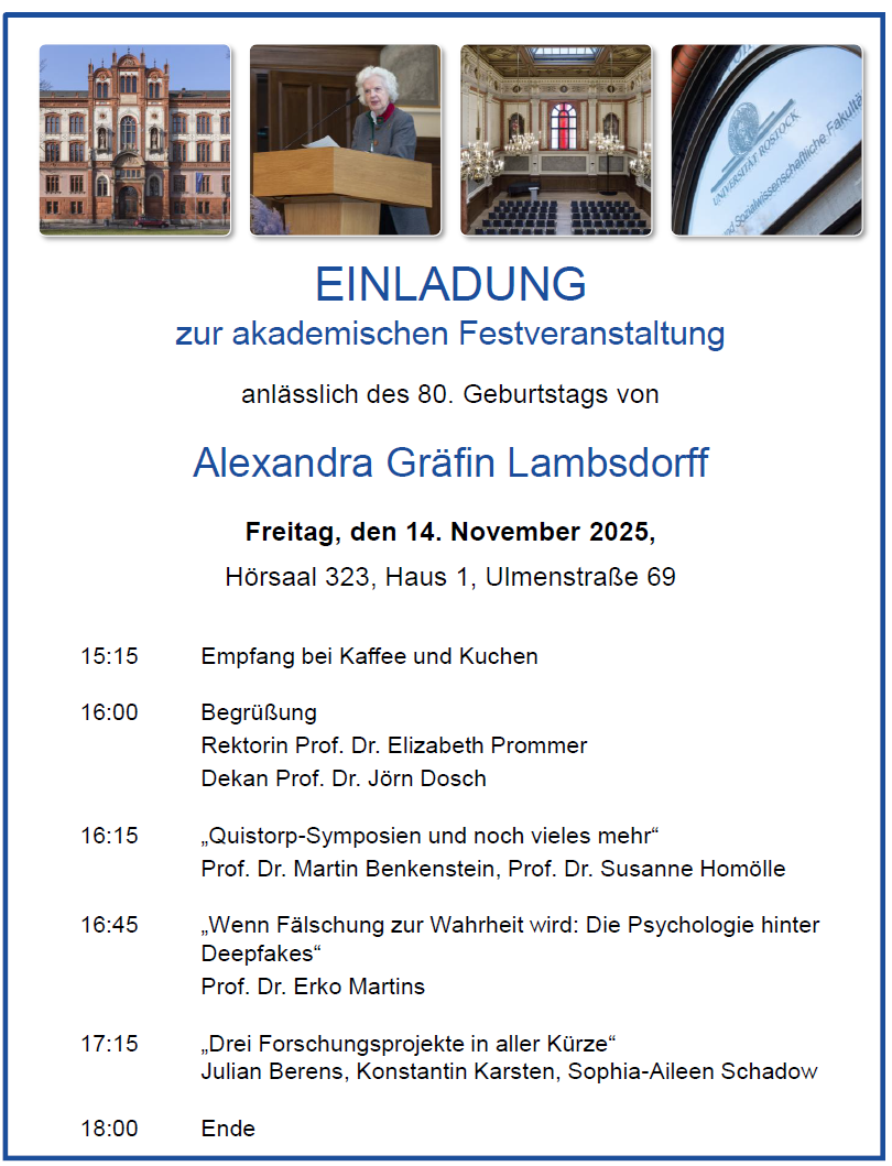 Inhalt: Gräfin Lambsdorff, geb. von Quistorp, ist Ehrenmitglied der Universität Rostock und Initiatorin zur Gründung der Quistorp-Stiftung. Die Quistorp-Stiftung wurde unmittelbar nach der Wiedervereinigung bereits am 14.12.1990 gegründet und vergibt seitdem regelmäßig Stipendien zur Förderung von Wissenschaft und Forschung. Weiterhin ist diese Stiftung Mitveranstalterin von öffentlichen Symposien der Universität Rostock.