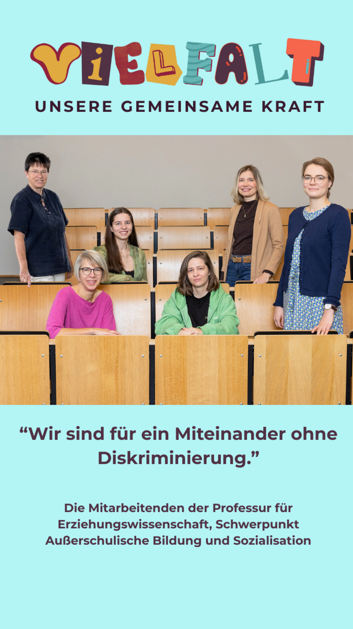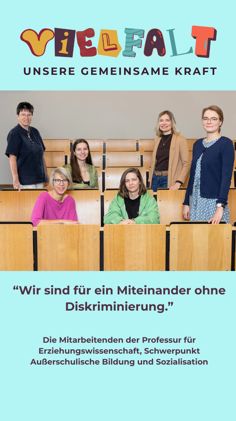 „Wir sind für ein Miteinander ohne Diskriminierung.“ - mit diesem Statement unterstützt das Team der Professur für Erziehungswissenschaft mit dem Schwerpunkt Außerschulische Bildung und Sozialisation die Aktion „Vielfalt – unsere gemeinsame Kraft“.