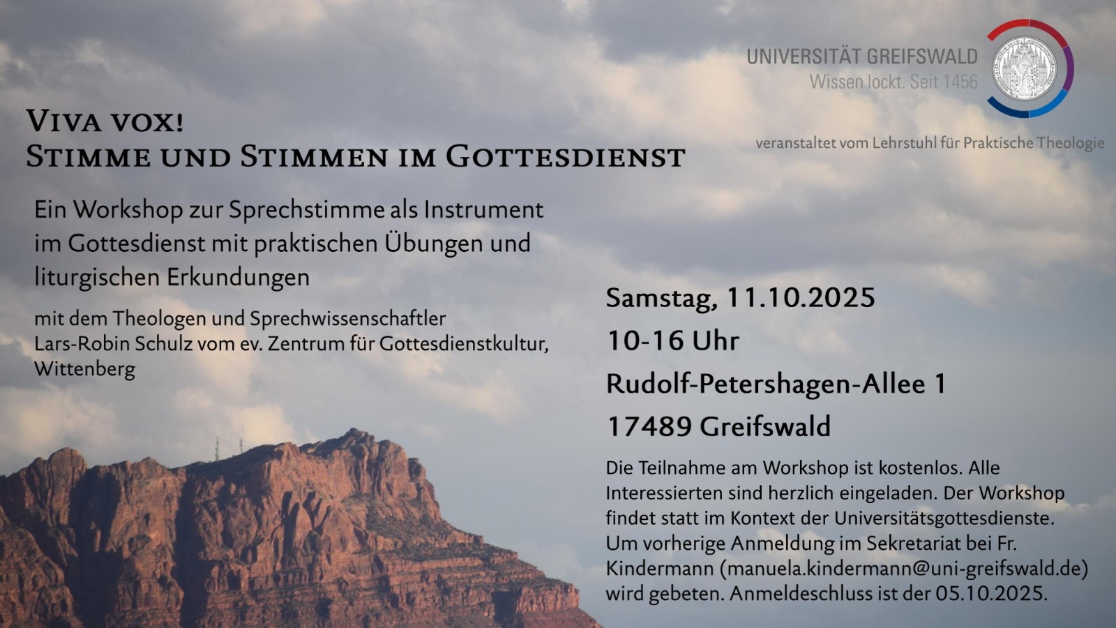 Mit unseren Stimmen füllen wir Räume: Zunächst unsere eigenen, inneren, körperlichen, dann die Umgebungen, in denen wir sie klingen lassen, schließlich die Räume im Gegenüber. Stimmen erzeugen Resonanz. In diesem Workshop beschäftigen wir uns mit dem ureigenen, menschlichen Instrument der Stimme. Wir gehen der Stimme praktisch nach, erkunden Atmung, Lautung und Artikulation am eigenen Körper. Wir loten den Raum aus und befragen damit, welche Funktionen die sprechende Stimme in der Liturgie hat. Zusprechen, Vor-sich-hin-Sprechen und aus sich herausgehendes Sprechen, also Predigt, Gebet und Lobpreis, zentrale Äußerungsformen des Gottesdienstes. Elemente aus dem, was wir erarbeiten, können in den Semestereröffnungsgottesdienst einfließen. Alle, die sich für das Sprechen in Gottesdiensten interessieren, sind eingeladen. Es ist nicht ausgeschlossen, dass es Spaß macht.