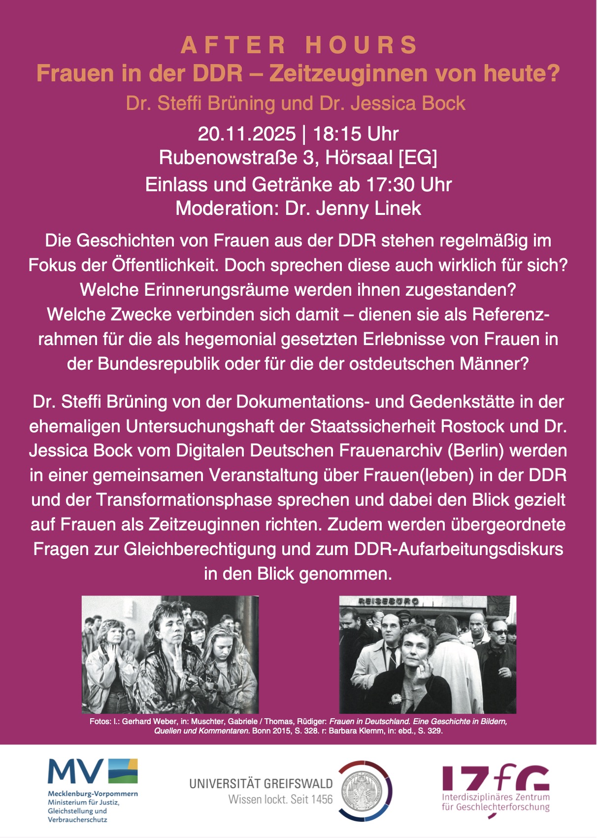 Diese und weitere Fragen sollen in einer After Hour mit zwei Expertinnen zur DDR-Geschichte nachgegangen werden. Dr. Stefanie Eisenhuth vom Leibniz-Zentrum für Zeithistorische Forschung in Potsdam und der Universität Greifswald (Lehrstuhl für Allgemeine Geschichte der Neuesten Zeit) und Dr. Jessica Bock vom Digitalen Deutschen Frauenarchiv (Berlin) werden in einer gemeinsamen Veranstaltung über Frauen(leben) in der DDR und der Transformationsphase sprechen und dabei den Blick gezielt auf Frauen als Zeitzeuginnen richten. Zudem werden übergeordnete Fragen zur Gleichberechtigung und zum DDR-Aufarbeitungsdiskurs in den Blick genommen.