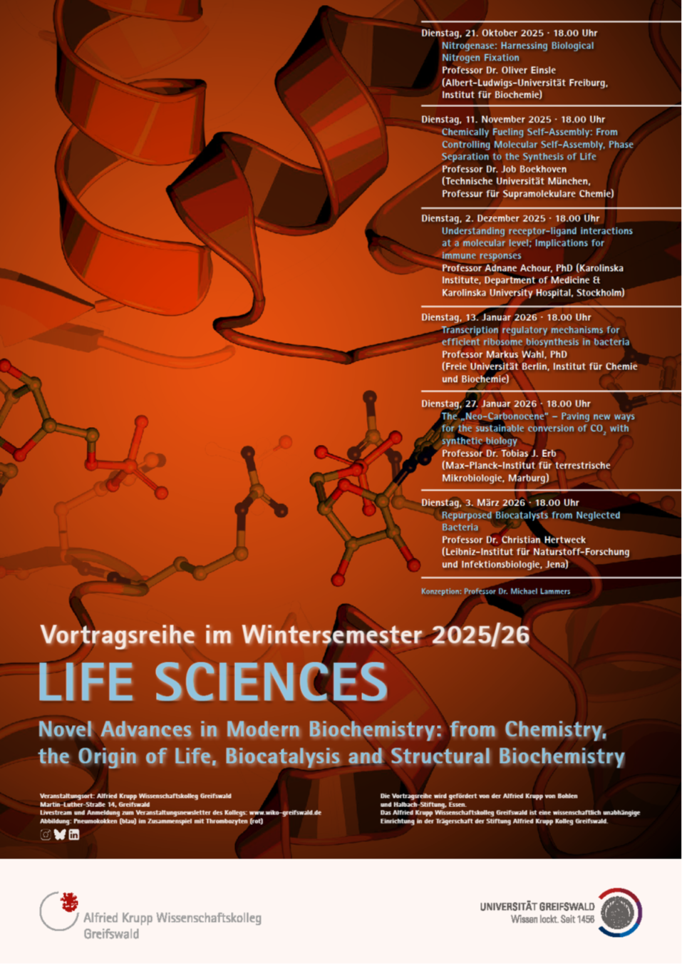 Biochemistry is the scientific discipline that studies the molecular structures and chemical processes occurring in living organisms. While originating in the 19th century with the research done by scientists such as Eduard Buchner, Justus von Liebig or Emil Fischer, it is nowadays a fundamental discipline studying the structure and function of biomolecular macromolecules such as proteins and nucleic acids, the regulation of metabolism, mechanisms of enzyme catalysis and the origin of life. This lecture series LIFE SCIENCES „Novel Advances in Modern Biochemistry: from Chemistry, the Origin of Life, Biocatalysis and Structural Biochemistry” will introduce you to recent developments in modern biochemistry. over the past few decades, methodology in biochemical research has made enormous progress enabling mechanistic insights into structure and function of megadalton complexes such as ribosomes to be obtained, and allowing the design and generation of artificial cells in synthetic biology. It has also enabled the engineering of genome-editing tools such as CRISPR-Cas9 as well as novel plastic degrading enzymes, and fundamental cellular processes to be explored at atomic resolution. Recently, significant progress in artificial intelligence has enabled the prediction of protein structures and the design of proteins with important applications in medicine and biotechnology. In this lecture series leading experts in the field of Biochemistry will present their research on fundamental scientific questions applying state-of-the-art methods including synthetic biological approaches, cryo-electron microscopy and X-ray crystallography as well as the chemical synthesis of supramolecular materials.