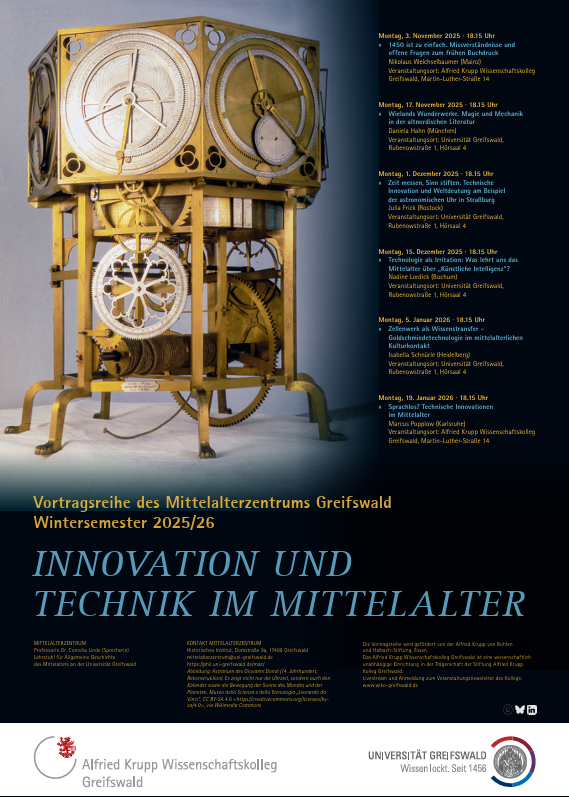 In meinem Vortrag möchte ich Technik – in diesem Fall „Künstliche Intelligenz“ –, angelehnt an Alfred Nordmanns Konzept von „Technik“ als Reflexionsbegriff, als Moment der Irritation ernstnehmen und mit einem Blick auf mittelalterliche Literatur versuchen, Aspekte der Debatte einmal auf andere Weise zu perspektivieren.