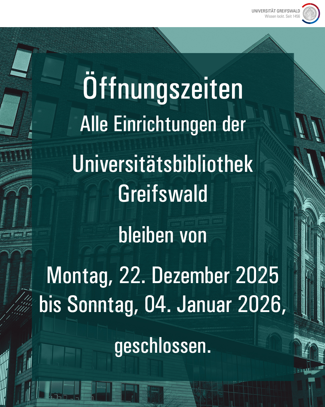 Alle Einrichtungen der Universitätsbibliothek Greifswald bleiben von Montag, 22. Dezember 2025, bis Sonntag, 04. Januar 2026, geschlossen.