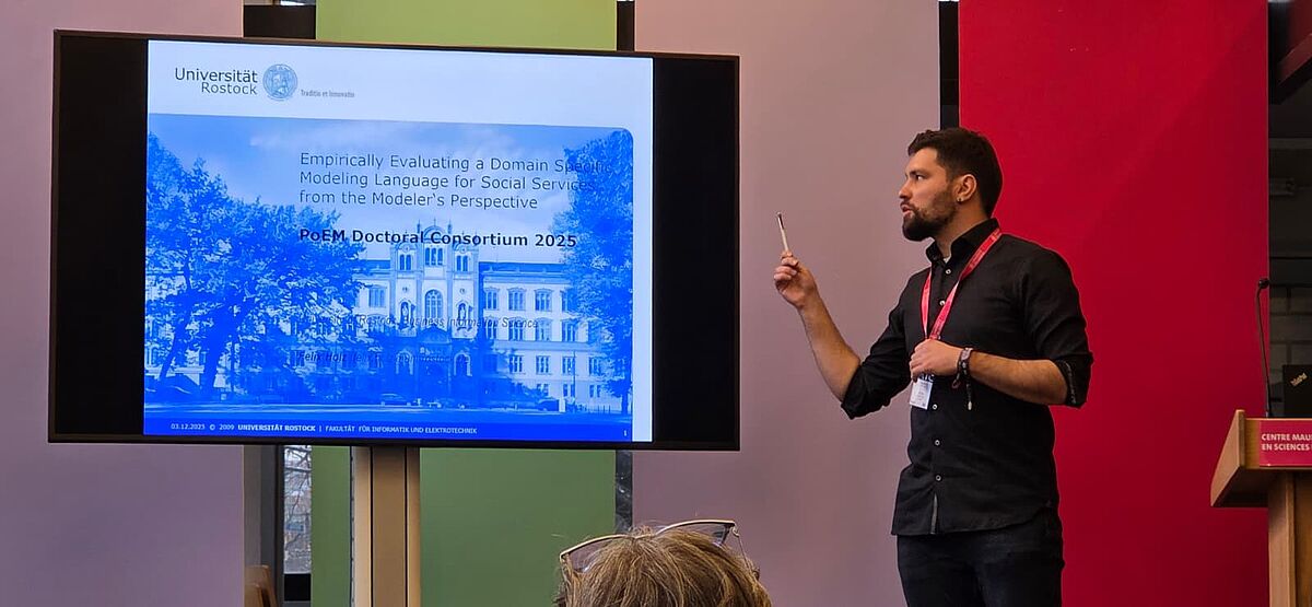 Ahmed Dehne (From Fragmented to Holistic: A Methodological Framework for Variability Management in Enterprise Architecture) und Felix Holz (Empirically Evaluating a Domain Specific Modeling Language for Social Services from the Modeler's Perspective) präsentierten ihr Forschungsthema im Doctoral Consortium.
