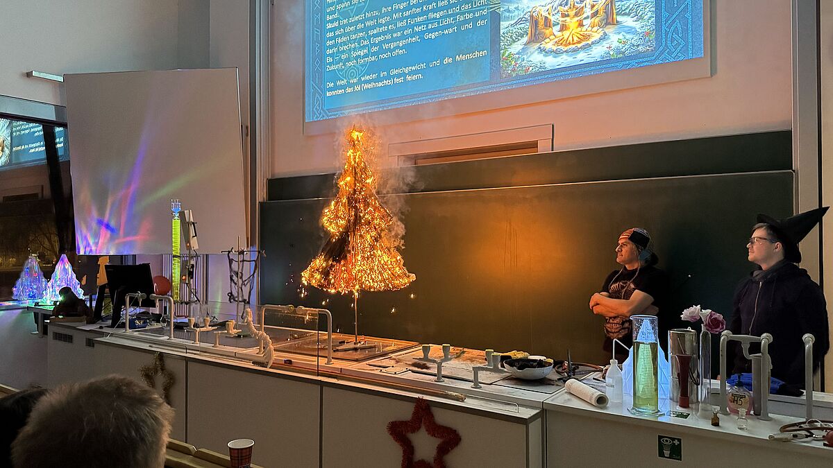 Unter dem Motto “Magisches Midgard – Die Alchemie der Nornen” wurden eindrucksvolle Schauexperimenten in Erzählungen aus der nordischen Mythologie eingebettet. Eine Stunde lang wurde das Publikum im vollbesetzten großen Hörsaal in eine faszinierende Welt aus Chemie und Magie entführt. Die zahlreichen Experimente, die das Publikum mit Lichteffekten und Feuerzauber begeisterten, wurden mit großer Aufmerksamkeit verfolgt.