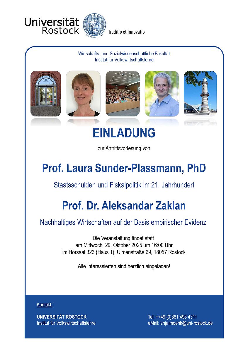 Antrittsvorlesungen 29.10.2025 Wirtschafts- und Sozialwissenschaftlichen FakultätEinladung zur Antrittsvorlesung von Prof. Dr. Laura Sunder-Plassmann (PhD) und Prof. Dr. Aleksander Zaklan weiterlesen