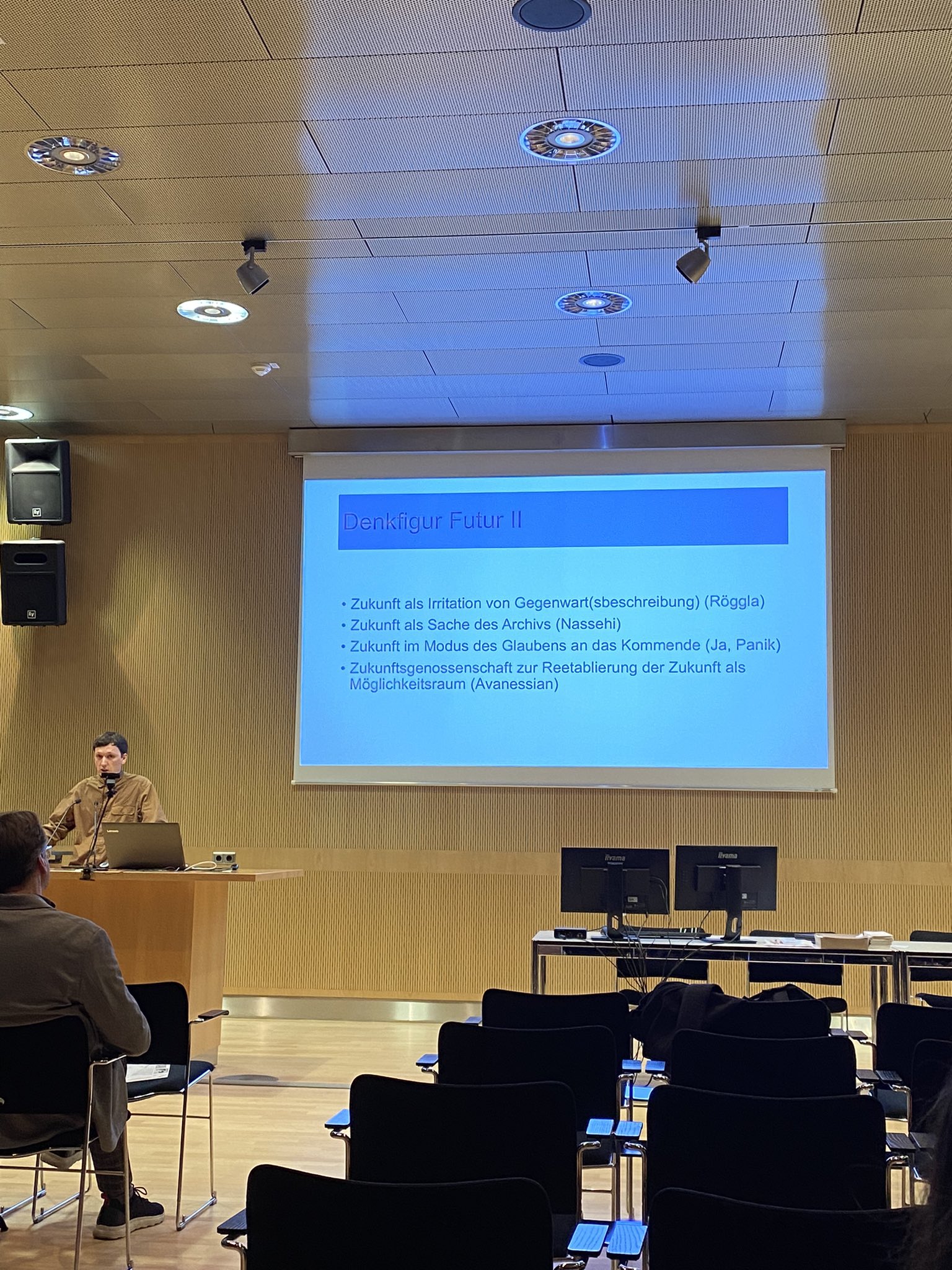 Anschließend schenkte Elias Kreuzmair seine Aufmerksamkeit der Zukunft und den Möglichkeiten die das Futur II als variable Zeitform für diese Untersuchung des Konzepts bereithalte. In Anlehnung an Douglas Rushkoffs Präsentismus-Diagnose des Present Shock (2014) diskutierte er die Idee eines future shock an verschiedenen Texten, die vor dem Hintergrund aktueller Präsentismus-Diagnosen einer zusehends als katastrophal verhandelte Zukunft im Modus des Futur II begegneten und damit einen veränderten Umgang mit dieser markierten. Das Futur zwei, das Kathrin Röggla in „Gegenwart vs. Futur II“ (2016) als abgeschlossene Zukunft entwirft, sei dabei immer schon auf problematische Weise in die Gegenwart integriert. Problematisch deshalb, weil es den Blick auf eine offene Zukunft unmöglich mache und zur Irritation von Gegenwarts(beschreibungen) werde. In Armin Nassehis Muster: Theorie der digitalen Gesellschaft (2019) wird die Zukunft symbolisch im Archiv abgelegt: Zukunftsglaube als Metaprophezeiung, die immer richtige wie falsche Versionen der Zukunft enthalten. Einem pragmatischen Ansatz verpflichtet setze er in Muster auf Problemlösung, eindebugging, und traue sich damit kaum über die Gegenwart hinaus. Es folgte ein Blick in das kollektive E-Mail-Tagebuch Futur II (2016) der Diskurs-Pop-Gruppe Ja, Panik, in dem diese auf einem emphatischen Konzept von Zukunft besteht. Im Modus des Glaubens an das Kommende wird Futur II für Ja, Panik zu einem Vorgehen, das künstlerische Prozesse in einem utopischen Sinne für zukünftige Anschlussmöglichkeiten offenhalte. Letztlich beschäftige sich auch Armin Avanessian mit Möglichkeiten, wie der diagnostizierte Präsentismus überwunden werden könne. Mit dem Konzept der Zukunftsgenossenschaft, das Avanessian in #Akzeleration (2013) entwirft, stelle er sich einerseits entschieden gegen Nassehi und radikalisiere Rögglas Vorstellung einer aus der Zukunft beeinflussten Gegenwart, was hier zu einer grundlegend veränderten Zeitwahrnehmung werde, für die es schreibend Gegenstrategien zu suchen gelte. Miamification (2017), ein Tagebuch zu einer Miami-Reise Avanessians, ließe sich demnach als ein solcher Versuch lesen, eine Zukunftsgenossenschaft zu erschreiben, die zur Reetablierung der Zukunft als Möglichkeitsraum führe. In der Diskussion wurde insbesondere darauf verweisen, dass alle diese Ansätze die Reetablierung des linearen Zeitpfeils anstrebten anstatt Versuche zu dessen Überwindung zu skizzieren.